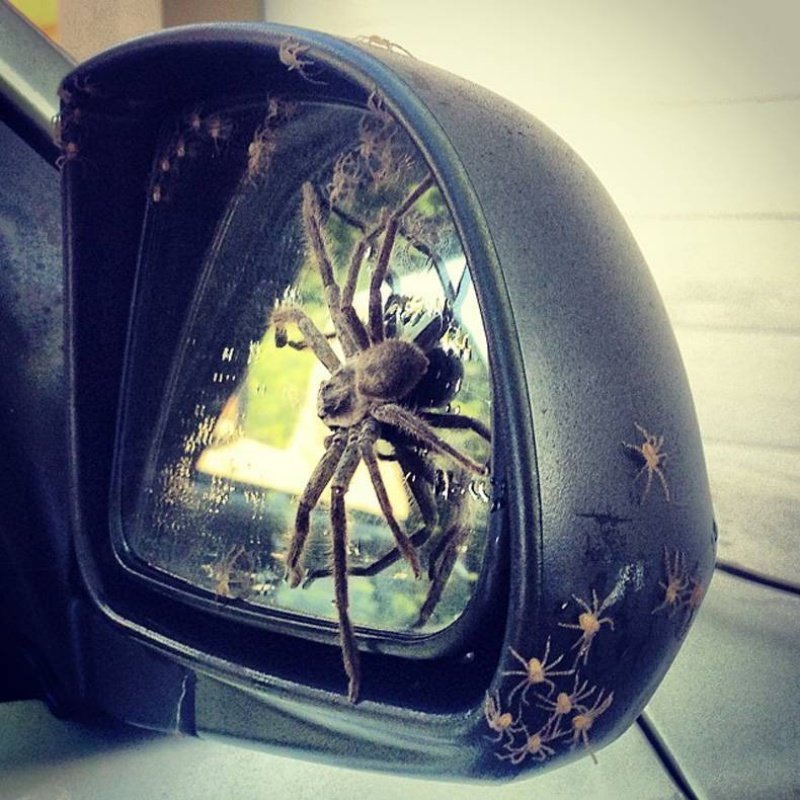 Семейство пауков в боковом зеркале автомобиля