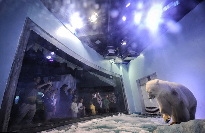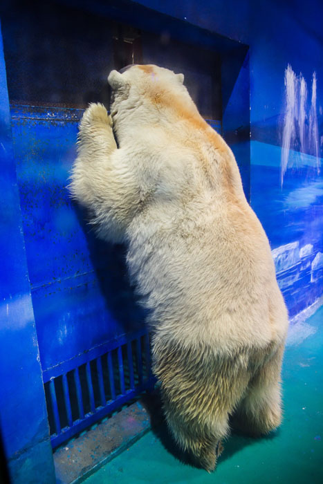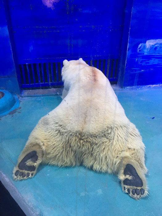 На одном из видео, снятым в этом зоопарке, можно увидеть белого медведя (скорее всего это был Пицца уже после того, как он остался в одиночестве), лежащего на бетонном полу. Вид мишки настолько несчастен, что странно видеть других посетителей, делающих селфи на его фоне. "Медведю просто некуда спрятаться от людей, делающих фотографии со вспышками, пишет Animals Asia. - Люди стучат по стеклу, кричат медведю. В этой обстановке нет ничего натурального, нет даже попытки как-то воссоздать естественную среду обитания животного, чтобы хотя бы хоть как-то восполнить нужды такого прекрасного создания как белый медведь.