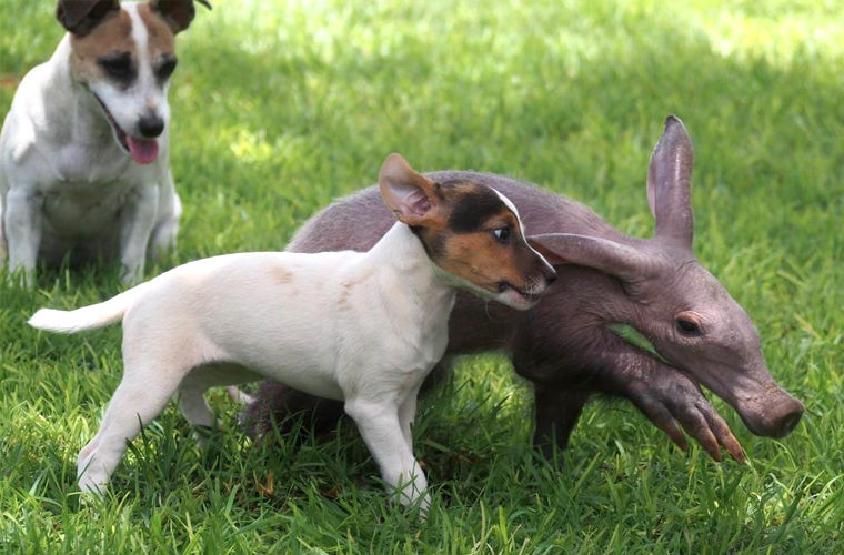 Спасенный трубкозуб обрел семью и новых друзей в лице 8 собак. Такая милота!