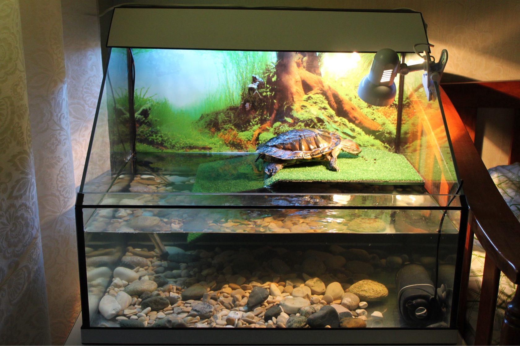 Аквариумы любят затемнённые места. Поэтому поставьте его в укромном уголке, куда не попадают прямые солнечные лучи, но есть доступ небольшого количества естественного света.