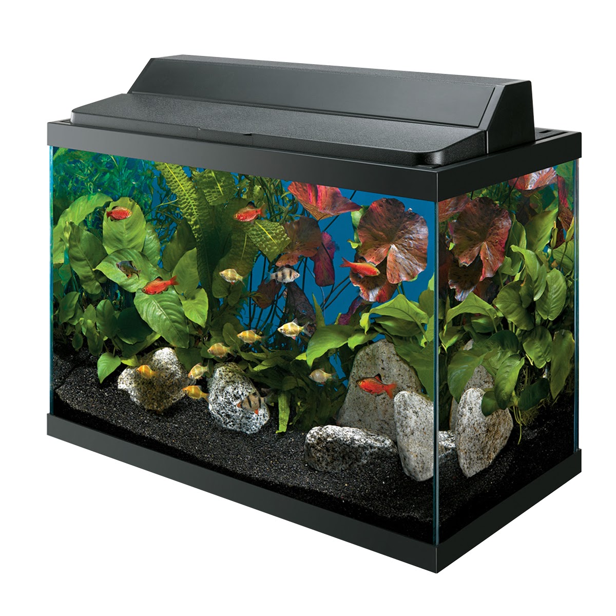 Баки продаются с крышкой, отдельной от светильника, или крышка и свет могут быть объединены в один блок, называемый «колпаком».»Крышка закрывает резервуар и служит для предотвращения выпрыгивания рыбы из резервуара. Она также снижает испарение и защищает свет от намокания. Если крышка совмещена с фонарем, она часто сделана из пластика, который является дешевле, меньше весит и не так легко разбить.Стеклянные крышки легче чистить, они плотнее закрывают и пропускают в аквариум больше внешнего света.