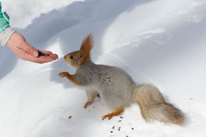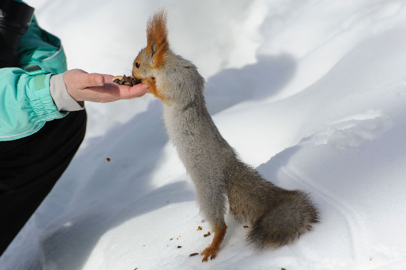 Подойдут яблоки и груши в свежем или сушеном виде. Важный момент: угощая белок, не пытайтесь их погладить. Они могут расценить это как угрозу и укусить, а ведь белки являются переносчиками различных заболеваний, в том числе бешенства. Лучше положите подкормку на ладошку и протяните. Не перекармливайте животных — они могут привыкнуть и перестать добывать корм самостоятельно, — рассказала Елена Шапетько.