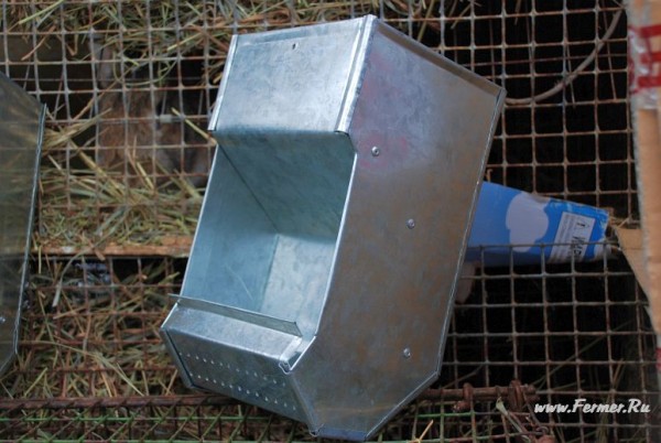 Распределитель кормовой смеси представляет собой узкое отверстие по всей длине кормушки. Сверху в бункер засыпается зерно. Затем оно по мере необходимости поступает на дно кормушки, где его и поедают кролики.