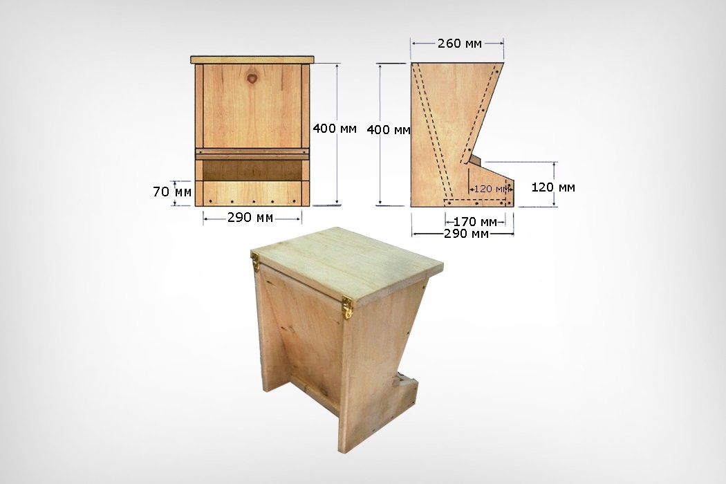 Дальше необходимо сделать макет емкости для корма. Точные размеры, а также схема конструкции приведены ниже.