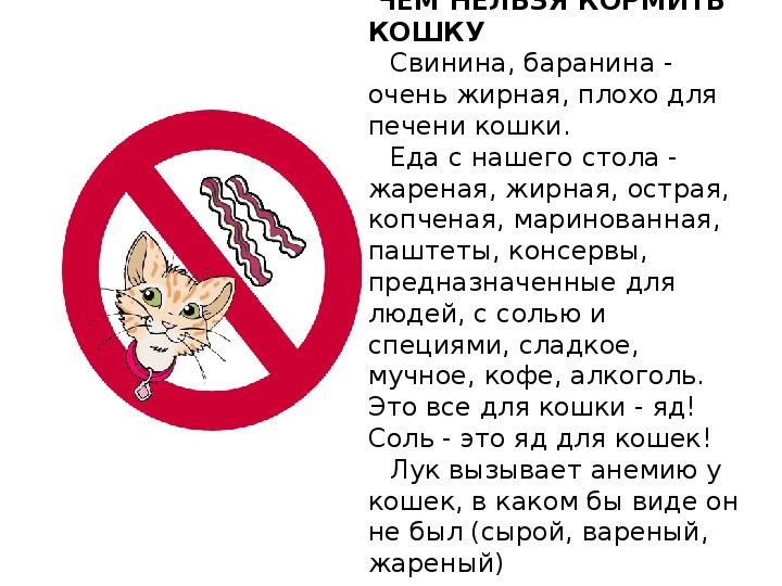 Если вы выбрали натуральную пищу для своего любимца, то помните, что кот – это не человек и кормить кота едой с хозяйского стола вовсе не годится. Кошкам нельзя большую часть из того, что и людям не особо полезно, а животным и тем более:жареное, соленое, маринованое, сладкое, печеное, специи.Если кошка постоянно будет питаться едой с вашего стола, у нее могут возникнуть проблемы с печенью, почками, желудком и кишечником. Это лечится очень долго и требует больших материальных вложений, не говоря уже о том, что процесс лечения весьма травматичен для психики как животного, так и его владельца. А так же не рекомендуем смешивать промышленный корм и натуральное питание, так как это ведет к сильному дисбалансу поступаемых в организм кошки питательных веществ.Нельзя давать кошке слишком горячую или слишком холодную пищу, например сразу из холодильника. Потому что при этом нарушается процесс пищеварения. Кошачий организм будет хорошо переваривать пищу, только если она определённой подходящей температуры.