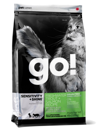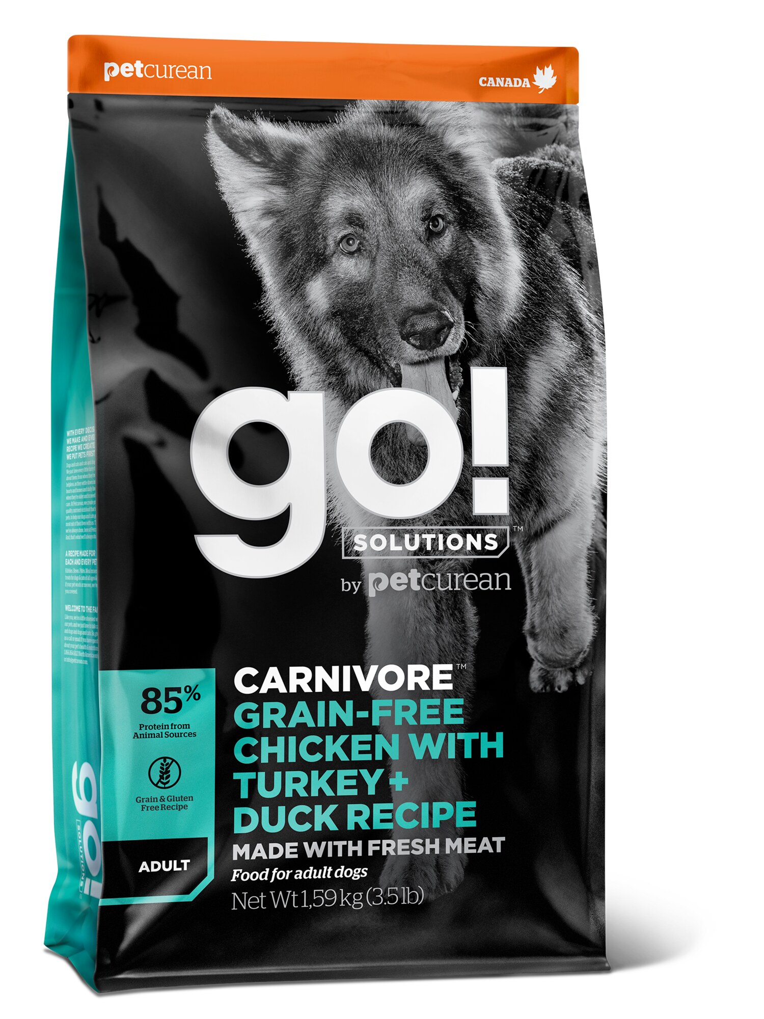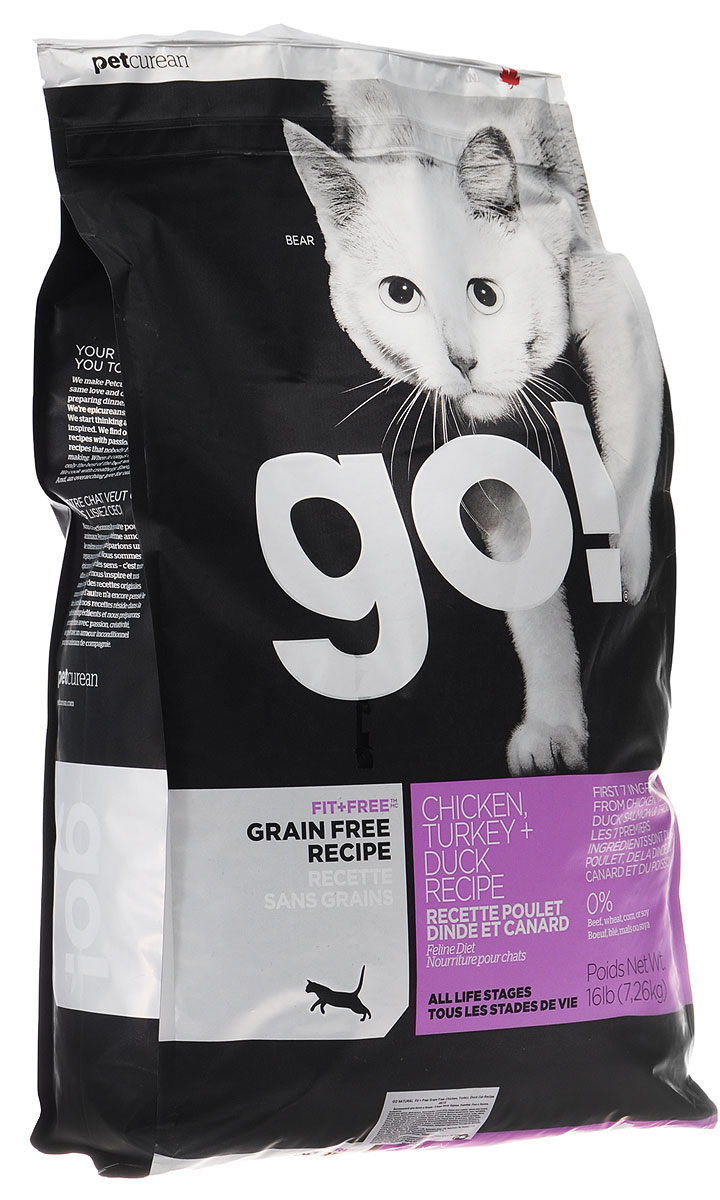 Основой для сухих кормов служит протеин животного происхождения. В Go! активно используются сочетания мяса и рыбы: курицы, индейки, утки, лосося, форели, сельди, яичного порошка. Иногда в составе Go! присутствует прессованный сыр. Необходимые для полноценного развития жиры тоже имеют животное происхождение – куриный жир.