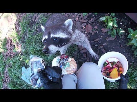 Еноты, проживающие в непосредственной близи к жилищу человека, питаются всем, что только могут найти: добычей из мусорки, пиццей, чипсами, газированной водой и прочими лакомствами.