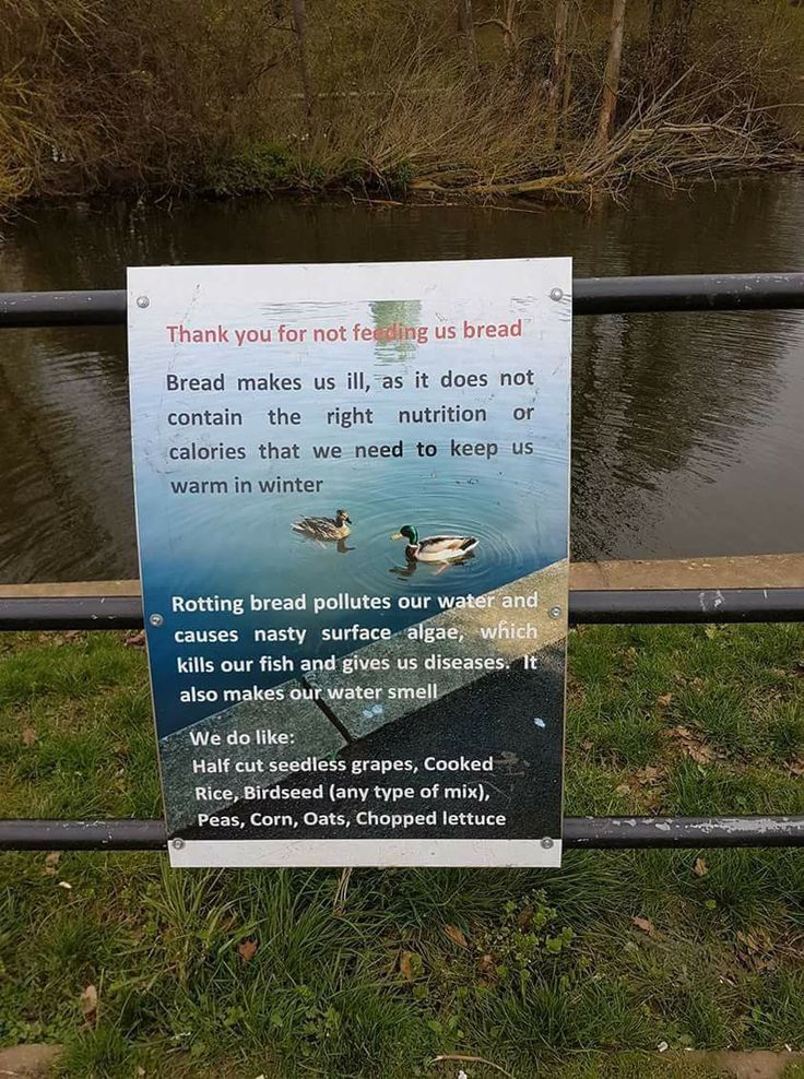 Если уток регулярно кормить хлебом, утята не получат достаточного питания для правильного роста и развития. Кроме того, поскольку утки будут охотно искать легкий источник пищи, такой как человеческие подачки, утята не научатся так же легко распознавать натуральные продукты или добывать их. - Перенаселенность : Там, где в изобилии имеется легкий источник пищи, утки и другие водоплавающие птицы откладывают больше яиц, и пруд или озеро быстро становятся переполненными. Это затрудняет поиск более здоровых источников пищи для птиц и увеличивает вероятность территориальной агрессии. В перенаселенных районах хищники также могут процветать и оказывать влияние на другие популяции птиц, а болезни также могут быстро распространяться среди больших стад.