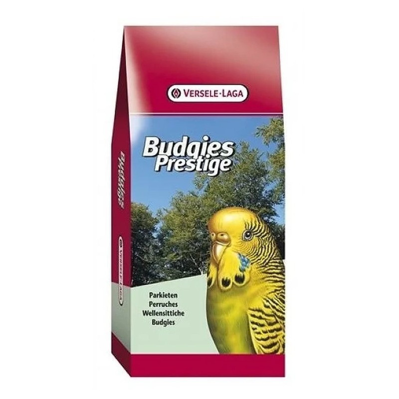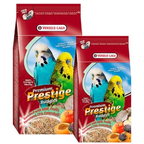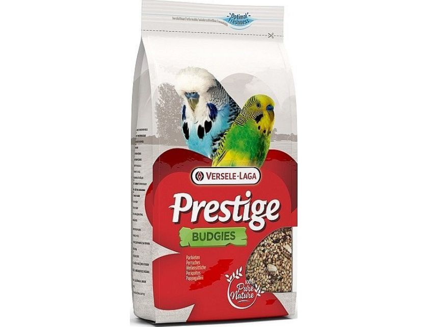 В отличие от многих других кормов, данный продукт бельгийского производства обходится исключительно натуральными ингредиентами, без красителей и специфических добавок. Благодаря этому корм удобно использовать в качестве основы, дополняя по мере необходимости другой едой. В составе Prestige Budgies три вида проса (жёлтое занимает 52% всего корма, красное и белое в совокупности — 28%), канареечное и льняное семя, очищенный овёс, сафлор и нуг. Особенностью марки является удобная многоразовая упаковка с «окошком», позволяющим рассмотреть корм до покупки, не вскрывая его.
