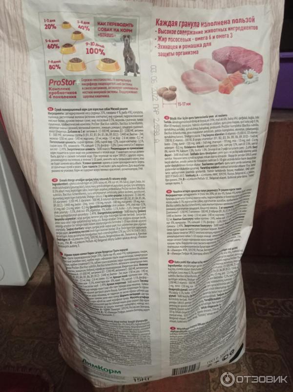 Комментарий: Корм устраивает всех. Предыдущий помимо того, что собака его отказывалась есть еще и запах имел отталкивающий. Этот брали раньше упаковками по 3 кг., но если честно замучился гонять в магазин раз в неделю. Второй раз покупаю большой мешок, который хватает приблизительно на 3 месяца. Запах приемлемый. Пересыпаю корм в пластиковую банку на 3л. и из него выдаю корм собаке, а мешок зажимаю зажимами и в укромное место.