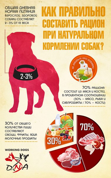*Так же применяют и такую формулу расчета: вес собаки Х 20 = результат в граммах — это и будет суточная потребность собаки в мясе. Около 20% от общего рациона составляют крупы. К мясу и крупам ещё добавляют овощи.