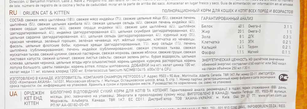 Гарантированный анализ Orijen Cat Food (Cat & Kitten):