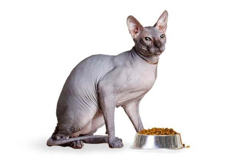 Выбор пищи зависит от возраста кота, состояния здоровья, пола и физиологии (стерилизация, беременность и др.) Кормить сфинкса ветеринары разрешают сухими и влажными кормами и натуральной пищей.