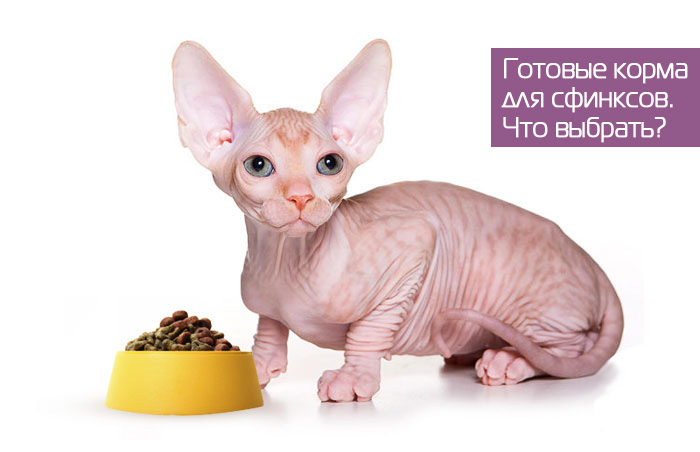 Готовые корма разрабатывают для разных возрастных категорий кошек. Во влажные или сухие корма входят все нужные элементы, комплекс минералов и витаминов. Если котенка дает заводчик, малыша не следует переводить сразу на новый вид питания. Первое время котик должен есть так, как он привык. Выбирать корм для сфинксов нужно тщательно, обязательно следует изучить состав продукции. Выбранное питание не рекомендуется менять на иное на протяжении всей жизни животного.