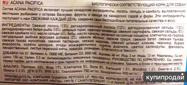 - Pacifica (Тихоокеанский)- произведен из свежего лосося, камбалы и сельди, в каждой грануле содержится 65% рыбы. Корм Acana Pacifica богат питательными, легко усваиваемыми белками рыбы и омега-3 жирными кислотами, способствующими поддержанию иммунитета и здоровья кожи и шерсти.