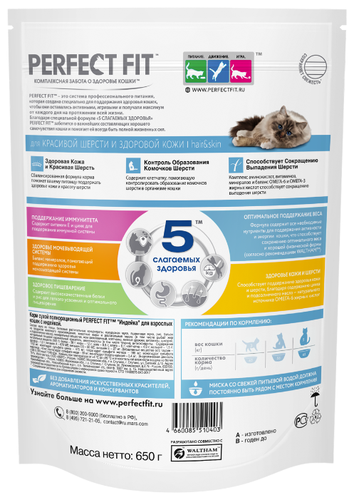 PERFECT FIT HAIR & BEAUTY – рекомендуется владельцам пушистых питомцев, поскольку улучшает состояние шерсти: она становится шелковистой, блестящей, имеет здоровый вид. В составе несколько больше мясных продуктов, чем в других кормах, также нет сои, зато в составе целлюлоза и цикорий. Увеличено количество таурина и витамина А.