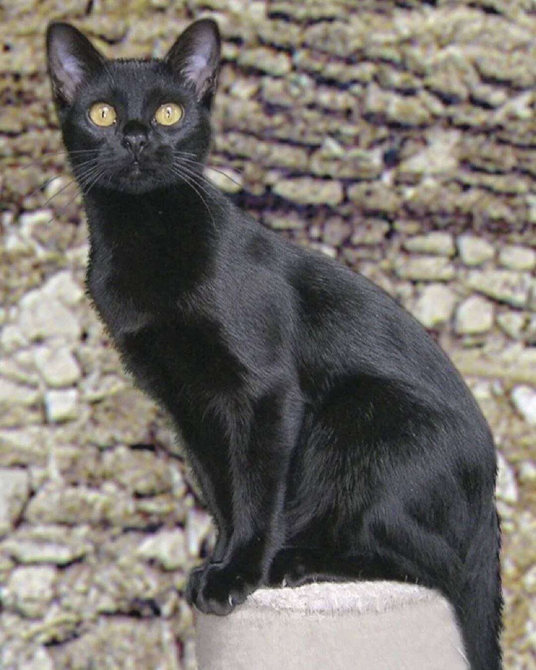 Ориентальная кошка имеет своеобразную внешность и собачьи повадки. Эта необычная порода насчитывает более 300 вариантов окраса. Черный гладкошерстный кот этой породы имеет атласную блестящую шерсть, ворс плотно прилегает к туловищу и на ощупь очень шелковистый. Черный окрас ориентальных кошек более точно называется «эбони», такие питомцы похожи на изящные фарфоровые статуэтки с лоснящейся шерстью. Глаза почти у всех кошек этой породы обычно изумрудные, поэтому выглядят они завораживающе.