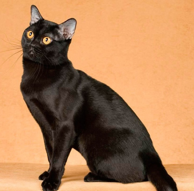Это красивая порода кошек — единственная в мире, кто по своим международным стандартам допускает только черный окрас. Причем черного цвета должны быть также нос и подушечки на лапах. Любое отклонение от угольного оттенка или наличие блеклых пятнен считается серьезным браком. Шерсть этой кошки очень гладкая и блестящая, напоминает шелк. Черные кошки и коты этой породы также знамениты своими желтыми глазами, это уникальная особенность, которая делает внешность животного ни с чем не сравнимой. Особенно ценятся глаза темно-янтарного оттенка, круглые, блестящие и очень яркие. Выглядит бомбейская кошка в целом как миниатюрная домашняя копия дикой пантеры.