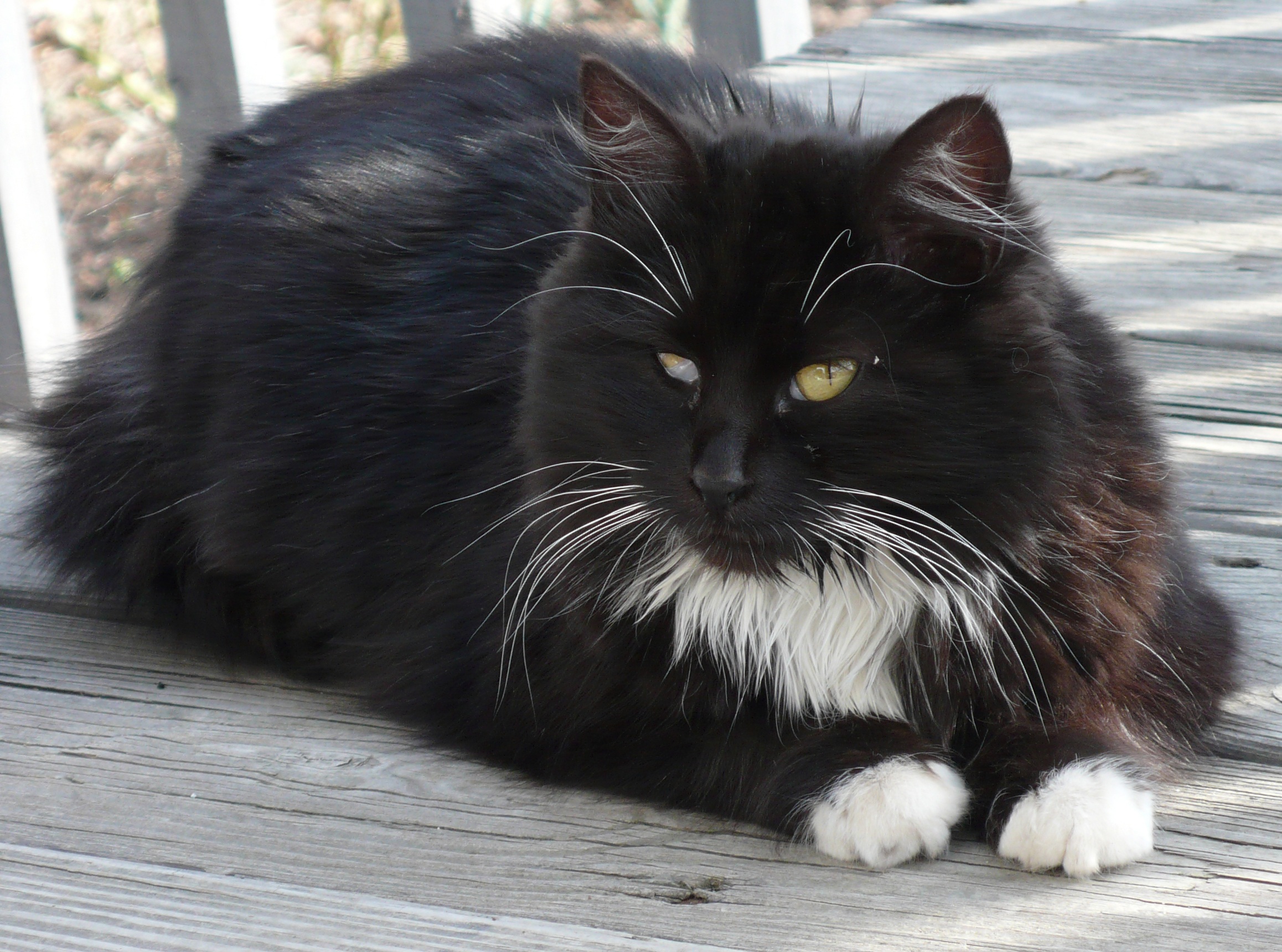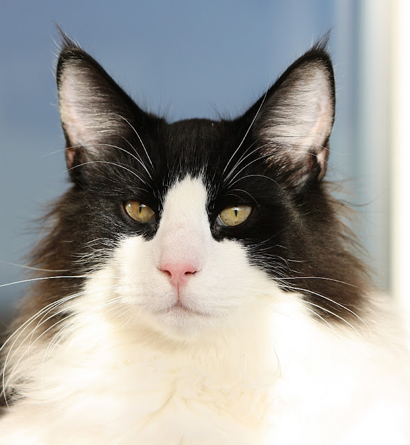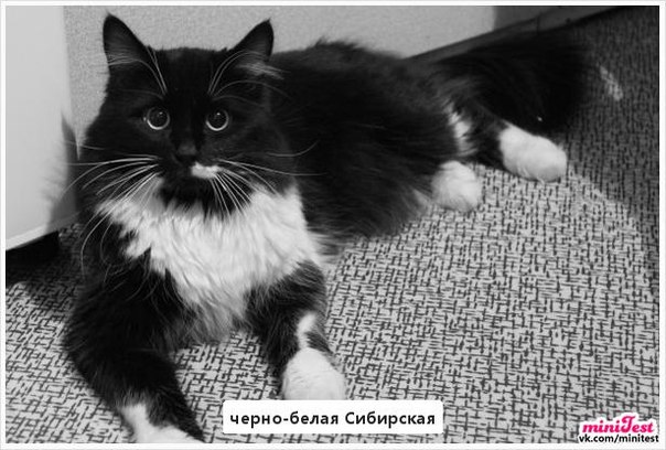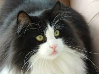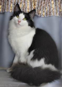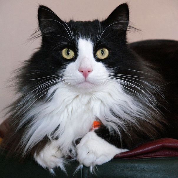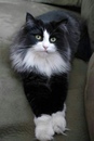 Черный кот норвежской породы встречается не так редко. Также бывают вариации черного с белым (как на фото). В случае комбинации черного с белым, кошки очень похожи на домашних, одетые во фрак, с белыми носочками. Они очень красивы и элегантны. Нужно отметить, что черных норвежских лесных кошек отличают ярко изумрудные глаза. Очень редко у кошек данного окраса бывают глаза другого цвета. Таким же цветом глаз может похвастаться и черно-белая кошка норвежской породы.