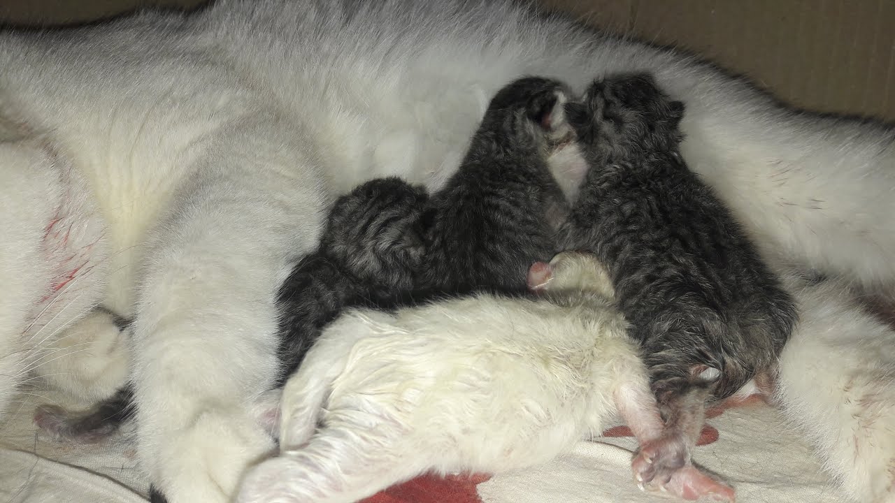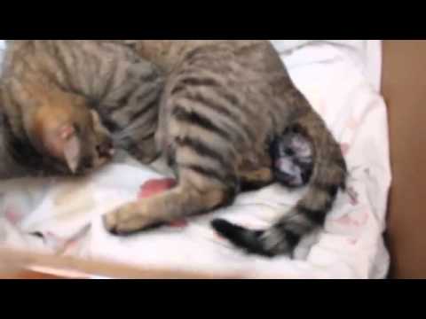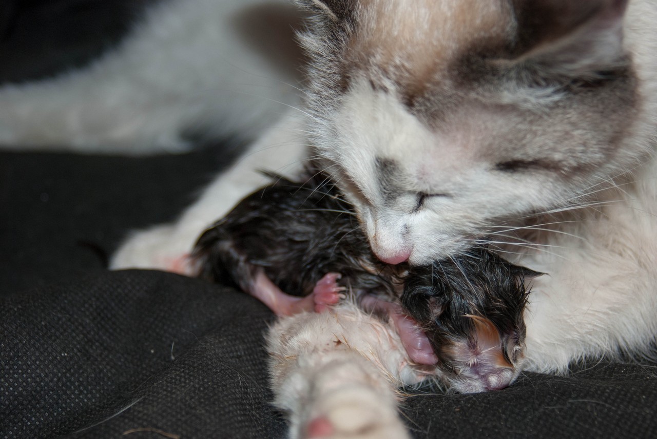 В идеале котята рождаются в пузыре и головой вперед. Мать разрывает пузырь, вылизывает котенка, чтобы он начал дышать, откусывает пуповину, съедает послед (плаценту, детское место).