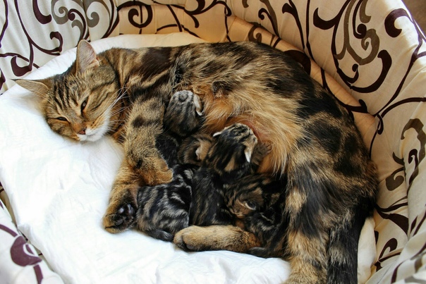 Затем она укладывается, чтобы новорожденный котенок нашел сосок и начал сосать. Это стимулирует схватки и рождение следующего котенка. Обязательно проследите, чтобы число вышедших плацент совпадало с количеством котят! Считать плаценты во время родов обычно некогда — кошачий акушер должен следить за поведением роженицы, течением родов и за новорожденными, поэтому просто складывайте все вышедшие последы в заранее подготовленную банку с водой. После того как роды завершатся и мать с котятами уляжется в гнезде, вы сможете пересчитать последы и проверить их целостность. Занятие малоприятное, но постарайтесь отнестись к этому без эмоций. Сделать это нужно обязательно: вы должны помнить, что оставшийся в матке послед или его часть вызовет сильное воспаление.