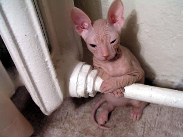 Лысые кошки и так-то довольно мерзлявы, даже в теплый период года предпочитают спать в кровати, прижавшись к теплому боку хозяина. Что уж говорить о поздней осени и зиме, когда даже длинношерстным животным становится холодно. Распознать, что лысый кот начинает мерзнуть, довольно просто по его поведению. Животное ложится в наиболее теплые места – на батарею, на компьютер или ноутбук, на вытяжку — на кухне. При этом по утрам он категорически не хочет вылезать из кровати и недовольно мяукает, когда его любимая грелка-хозяин покидает постель.