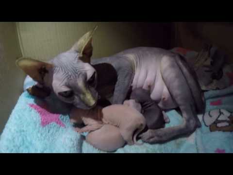 Признаки беременности становятся очевидными через 3 недели после вязки. Их нетрудно заметить, потому что сфинксы лысые. Соски увеличиваются и приобретают молочный или розовый оттенок. Прибавка в весе также является характерным признаком беременности.