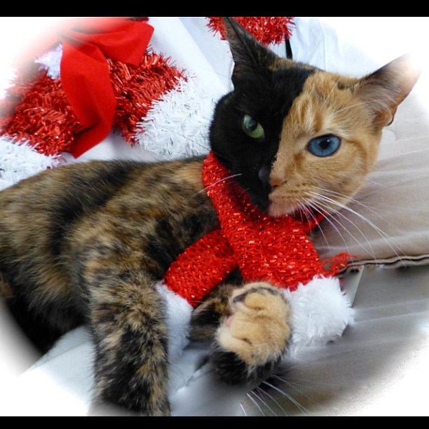 10) Этого кота-химера зовут Венера, и у него два лица; оранжевый с левой стороны с голубым глазом и черный с правой стороны с зеленым глазом. Врачи говорят, что возможно у нее разные ДНК на каждой стороне лица. У Venus уже более 1,3 миллиона поклонников в Facebook.