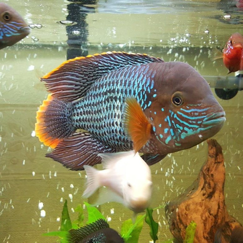 б. крупный жировик на голове. Яркая, зеленоватая с бирюзовым отливом. Плавники им. желтую, оранжевую или красную окантовку, спинной и анальный заостренные, а хвостовой – округлый. Живет до 10 лет. Неприхотлива, но сложно обеспечить нужные параметры воды, качественное кормление, подобрать подходящих соседей и обслуживать большой аквариум (новичкам не рекомендуется заводить).