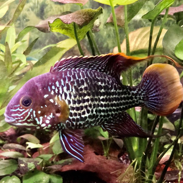 Разведение. Самец крупнее, им. жировую шишку на лбу и красную окантовку на хвостовом плавнике. Самки мельче, более агрессивны. Во время брачных игр рыбки становятся более яркими, самки темнеют, тело становится бирюзовым с ярко-синими отблесками. Для разведения лучше подбирать особей из разных пометов, линий и т. д. Пары, как правило, образуются сами собой. Если между самцом и самкой нет гармонии, то заменяют последнюю. Т 25-26 °C, рН 6.5-7, жесткость 4-12° dGH. Нерест можно стимулировать, заменив половину воды и немного повысив ее Т. Пара чистит камень, корягу или стекло на дне, куда впоследствии будет отложено до 600 икринок.