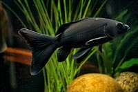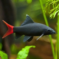 Лабео двухцветная достаточно широко распространена в аквариумном мире. Наиболее красива – рыба черная с красным хвостом. Она выглядит очень ярко и контрастно. Бархатистый черный цвет тела переходит в яркий красный плавник. В аквариуме эти рыбки достигают двенадцати сантиметров. Им нравится прятаться в укрытиях и пещерках, потому водоем нужно оборудовать всем необходимым. Кроме того, лабое отличаются задиристым характером. Очень часто они конфликтуют со своими соседями красного цвета или же с собратьями. В принципе, лабео можно держать с другими рыбками, но при условии, что аквариум будет достаточно большим (не менее ста литров).
