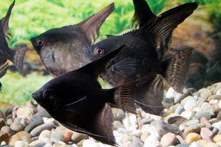 Меченосцы, гуппи и пецилии выведены в благородном черном цвете. Все вышеперечисленные разновидности отлично уживаются друг с другом. Прекрасную компанию им может составить орнатус фантом черного оттенка.Черные скалярии