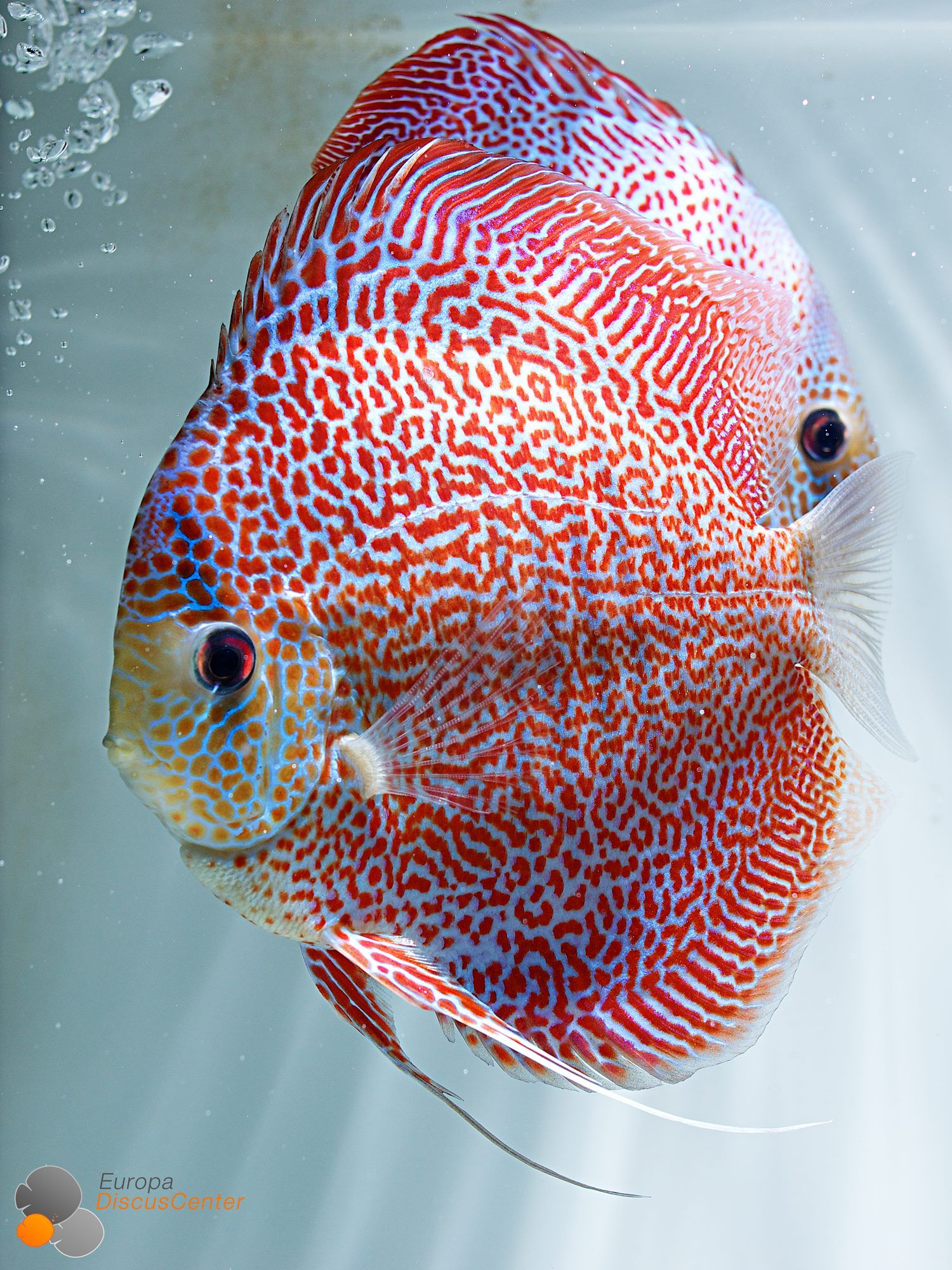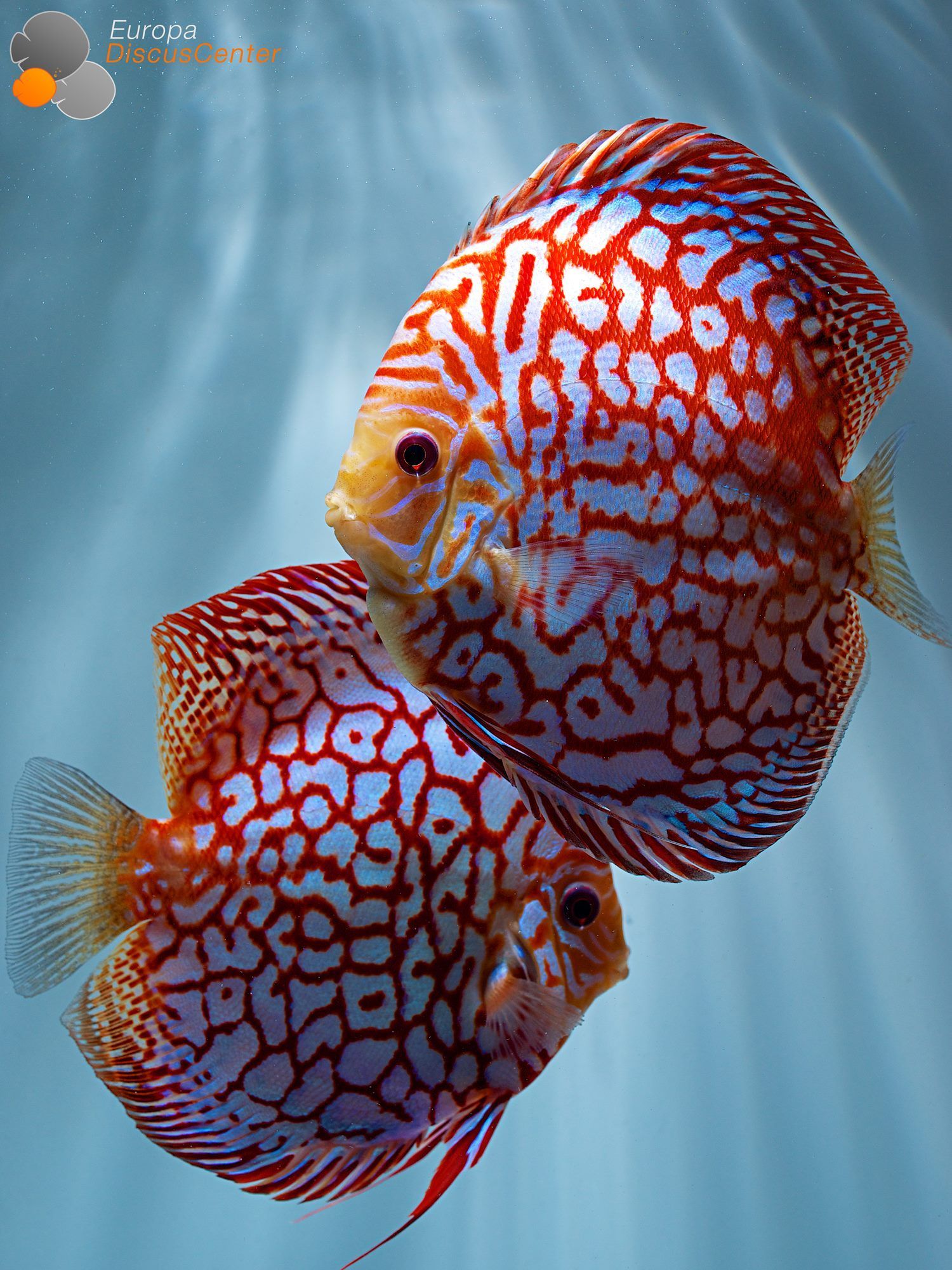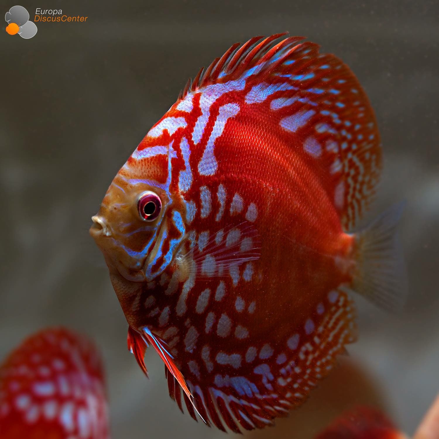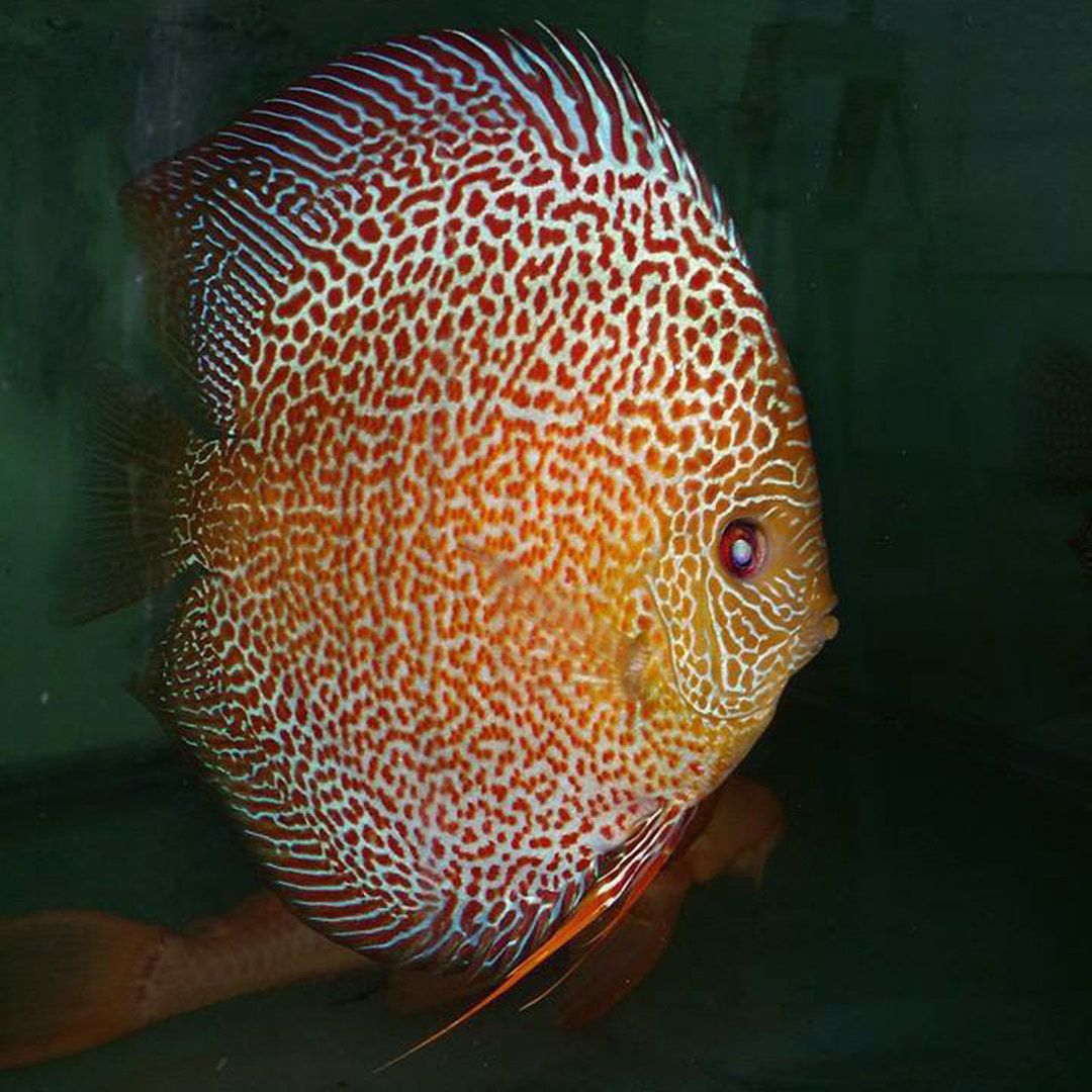 Гибридная разновидность, появившаяся благодаря скрещиванию красного туркиса и зеленого дискуса. Рыбка относится к альбиносам, имеет красные глаза и белую фоновую чешую, покрытую пятнами алого цвета. Собственно, за рисунок на теле она и получила свое прозвище. Леопардовые дискусы очень чувствительны к свету. Вырастают крупными — взрослая особь может достигать 20 см в длину.