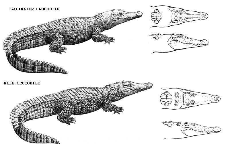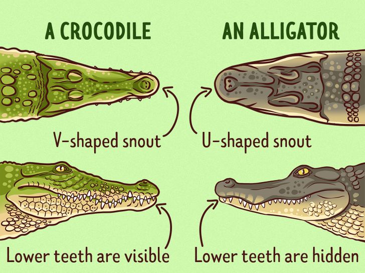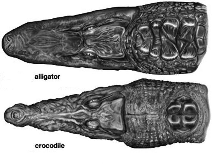 Отличить по внешнему виду крокодила от аллигатора, в общем не сложно, нужно лишь внимательно посмотреть на их морды. Первое, на что следует обратить внимание, это на конец морды: у крокодила морда всегда более узкая, V-образная, у аллигаторов же, она широкая и тупая — U-образная.