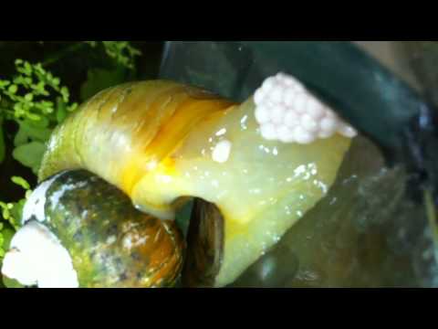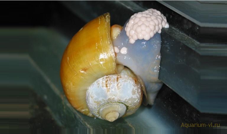Большинство улиток гермафродиты, то есть имеют сразу и мужские и женские половые органы. В большинстве случаев для спаривания нужна пара, которая отложить икру, в слизистой защитной пленке, в аквариуме ее часто можно увидеть под листьями растений.