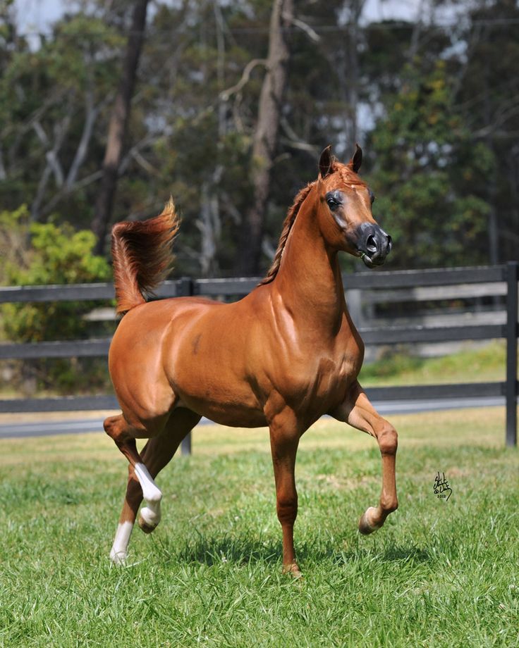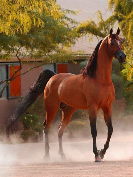 Арабские скакуны имеют небольшую голову с большими глазами. Шея высокая, с красивым изгибом. Грудь глубокая и широкая, спина также широкая. Отлично развитые, крепкие ноги увенчиваются прочными копытами. Еще один характерный признак лошадей арабской породы – «петушиный» хвост, который скакуны поднимают вверх во время быстрого бега.