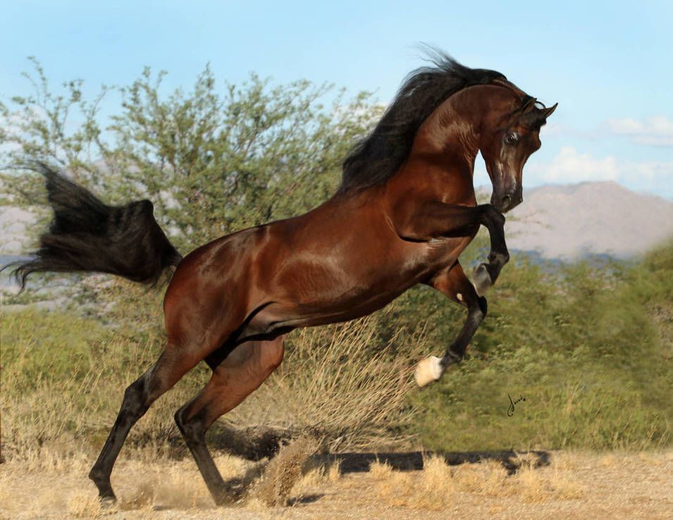 Арабская чистокровная лошадь принадлежит к самой древней именно «чистой» породе. Бедуины веками скрещивали между собой представителей с наилучшими данными и не позволяли их крови смешиваться ни с какой другой. В итоге получилось животное, с красотой которого мало что может сравниться. У арабской лошади благородная морда с большими выразительными глазами и необычный, так называемый, «щучий» профиль. Ноги словно точеные, а движение — легкие и грациозные. Спина короче, чем у других пород. И только араб может задорно поднимать хвост как в аллюре, так и в спокойном состоянии.