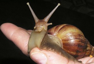 Achatina achatina , широко известная как гигантская африканская улитка Ганы , также известная как гигантская африканская улитка , гигантская наземная улитка-тигр и гигантокохлея , представляет собой разновидность большой, дышащей воздухом наземной улитки, наземного легочного брюхоногого моллюска семейства Achatinidae . Название «Ахатина» происходит от греческого слова «ахатес» — агат . Он имеет общее название « гигантская африканская улитка » с другими видами улиток, такими как Achatina fulica и Archachatina marginata .