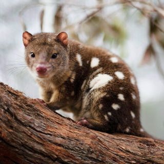ТАСМАНСКИЙ ДЬЯВОЛ . Являясь самым крупным из современных хищных сумчатых, это животное чёрного окраса с белыми пятнами на груди и крестце, с огромной пастью и острыми зубами имеет плотное телосложение и суровый нрав, за что, собственно, и было названо дьяволом. Издавая по ночам зловещие крики, массивный и неуклюжий тасманский дьявол внешне напоминает маленького медведя: передние лапки чуть длиннее задних, большая голова, мордочка притуплена.