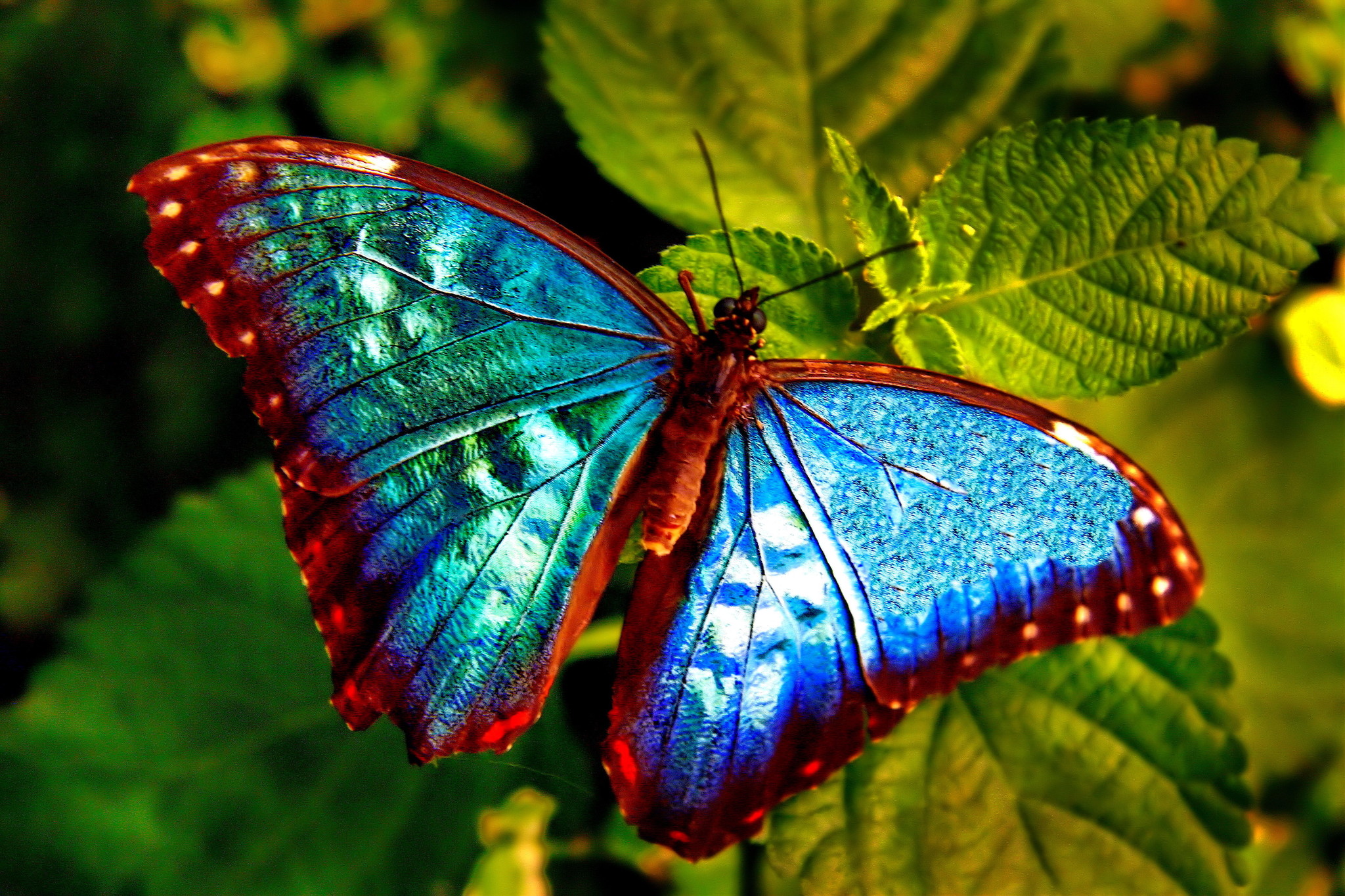 Следующую строчку в списке самых красивых бабочек в мире занимает Морфо Пелеида. Её название в переводе с греческого означает «красавица». Размах крыльев этой дневной бабочки составляет 10-12 см. Яркая сине-голубая окраска крыльев обрамляется чёрной каймой с белыми крапинками. Нижняя сторона крыльев Морфо Пелеиды серо-коричневая с тонким светлым рисунком в виде полос и кругов, напоминающих глаза.