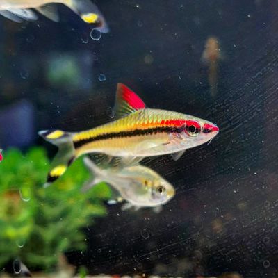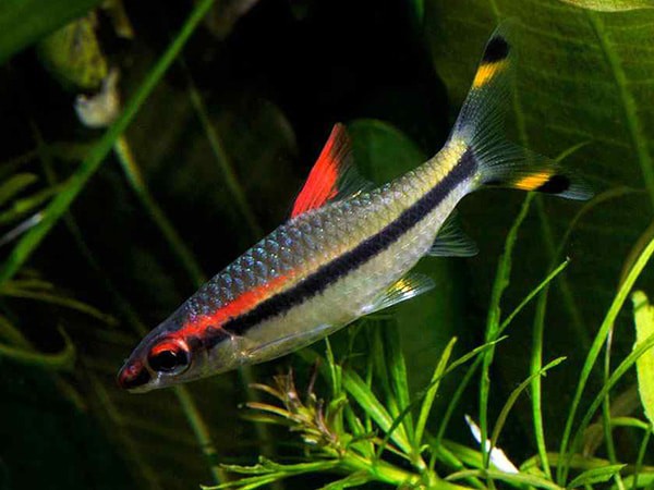 По всей длине рыбы проходит черная боковая полоса. Он проходит от кончика рыла до основания хвостового плавника. Над ним параллельная красная полоса! Алая линия начинается у морды, проходит через глаз и исчезает в средней части рыбы.