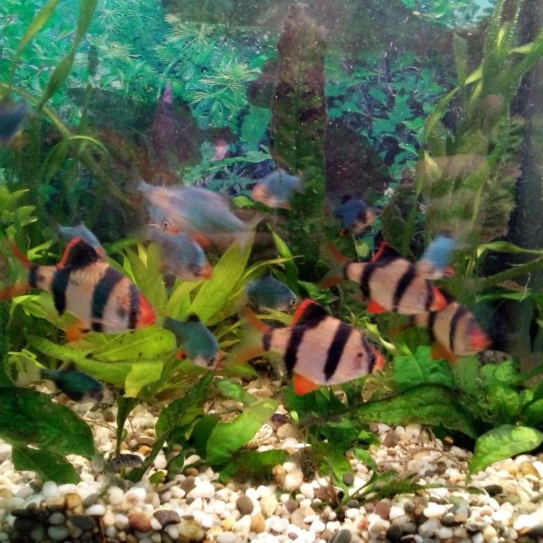 Эти нехитрые подводные предметы способствуют созданию уюта и эффектно украшают интерьер аквариума. Сверху резервуар обязательно закрывают стеклом или сеткой, иначе слишком активные барбусы начнут выпрыгивать из аквариума и погибнут на ковре. - Следующим важным моментом являются параметры жидкости, такие как температура, жёсткость и кислотность. Барбусы предпочитают хорошо очищенную мягкую воду от 21 до 26°C с уровнем кислотности от 6,5 до 7,5 pH и показателем жёсткости не выше 15 dGh. Каждую неделю воду необходимо менять, изымая до четверти объёма и заливая вместо неё свежую отфильтрованную жидкость. Ради справедливости стоит отметить, что барбусы прощают своим хозяевам незначительные огрехи в уходе и небольшие отклонения от органолептических норм воды. Они моментально адаптируются к новым условиям и спустя 5 минут после запуска начинают беззаботно носиться по аквариуму и устраивать свои игры.