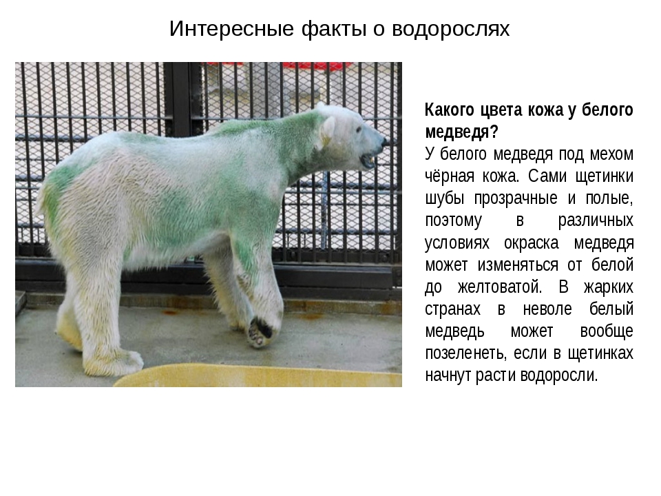 Разноцветные водоросли растут внутри полой трубки каждого волоска их шубы. Это зелёное растение цветёт во влажном климате, таком как Сингапур[26], который для белых медведей не является естественным.