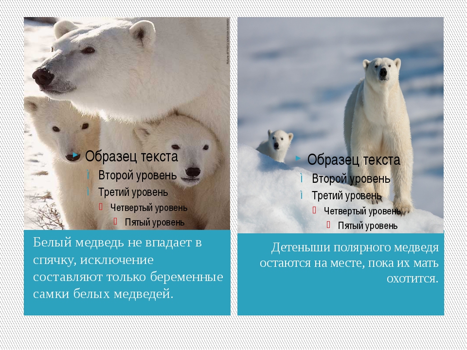 Когда дело доходит до охоты на свою естественную добычу, белые медведи отлично умеют нападать на тюленей и других животных ради пропитания.Их белый мех обеспечивает идеальный камуфляж на фоне снега и льда в окружающей их среде. Детеныши белых медведей держатся близко к своей берлоге, чтобы избежать нападений хищников.