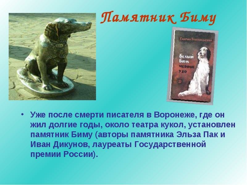 Произведение Г.Н. Троепольского говорит о добре и зле, дружбе человека и животного. Основной герой – собака Бим. Охотничий щенок еще в месяц от рождения был отдан новому хозяину – Ивану Ивановичу. Бим имел нетипичный для своей породы окрас, поэтому его не приняли в стаю других сородичей. Несмотря на все трудности, пес оставался добрым и веселым, ведь рядом с ним всегда был его самый лучший друг – хозяин. Мне кажется, что этим автор особенно хотел показать стойкость и силу духа собаки.