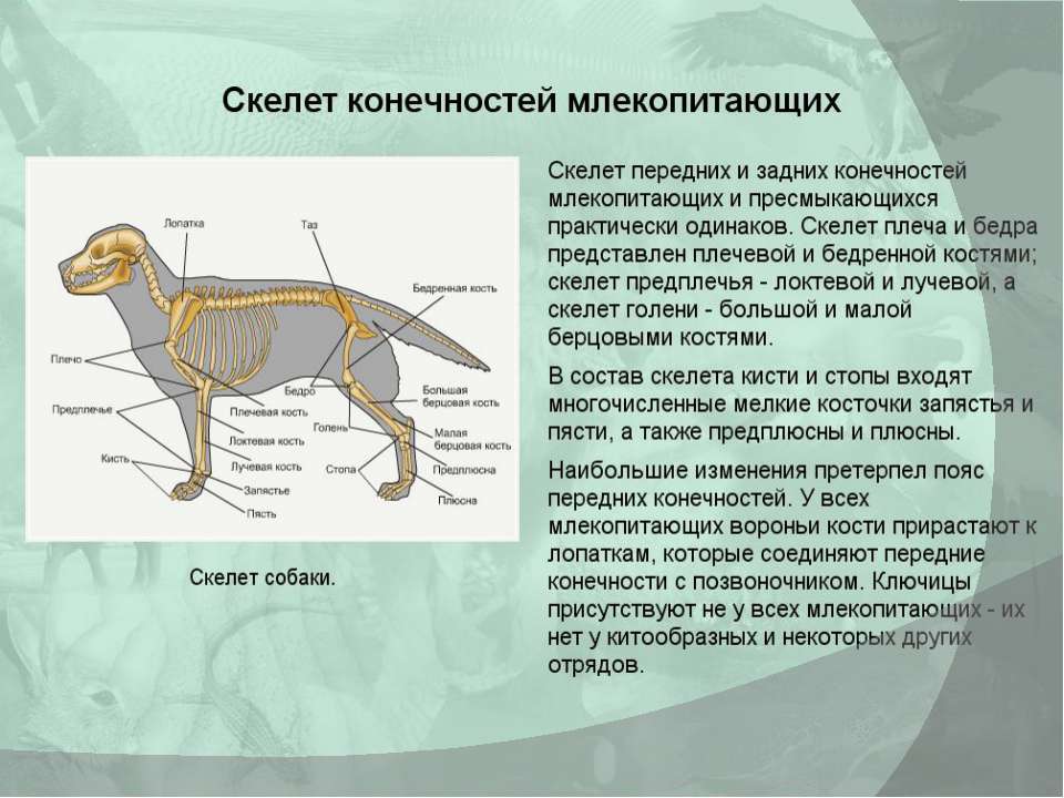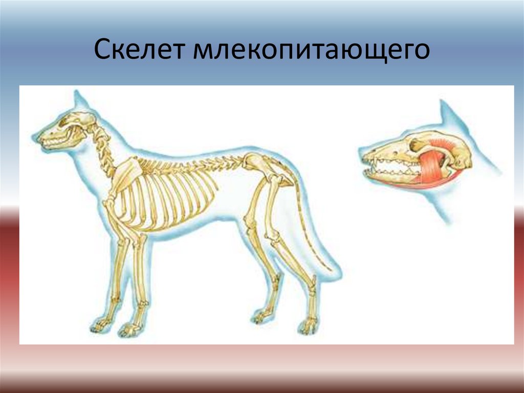 Скелет млекопитающих состоит из тех же отделов, что и у других наземных позвоночных – позвоночника, черепа, скелета туловища, поясов конечностей и двух пар свободных конечностей.
