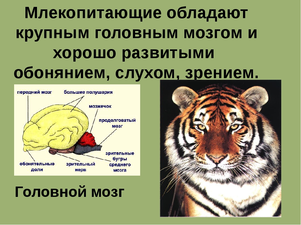 Головной мозг млекопитающих имеет крупные размеры. Особенно выделяются большие полушария переднего мозга. У большинства животных их поверхность (кора) складчатая.