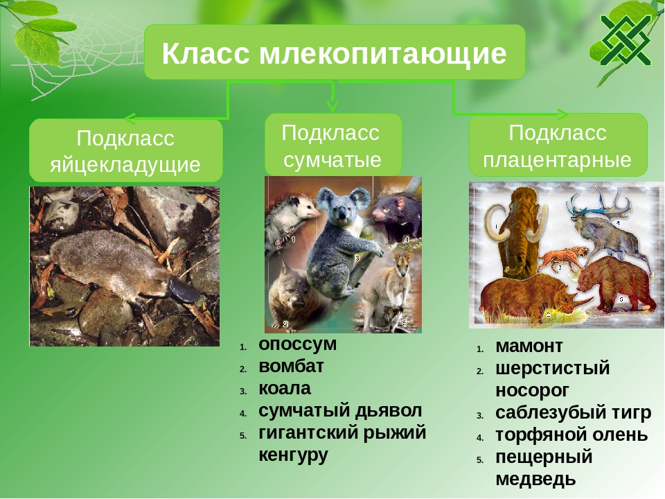 К классу принадлежат два подкласса: Первозвери, или Однопроходные, и Настоящие звери.