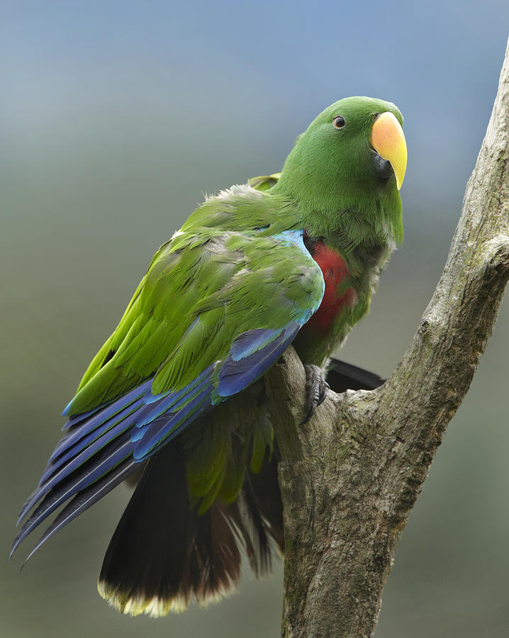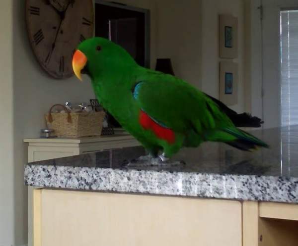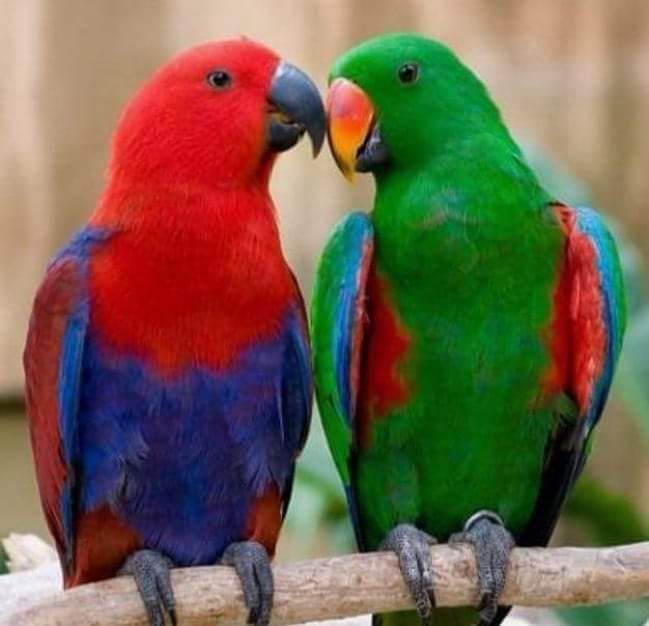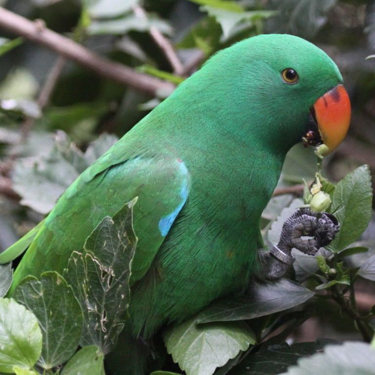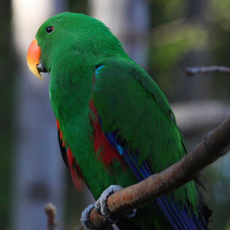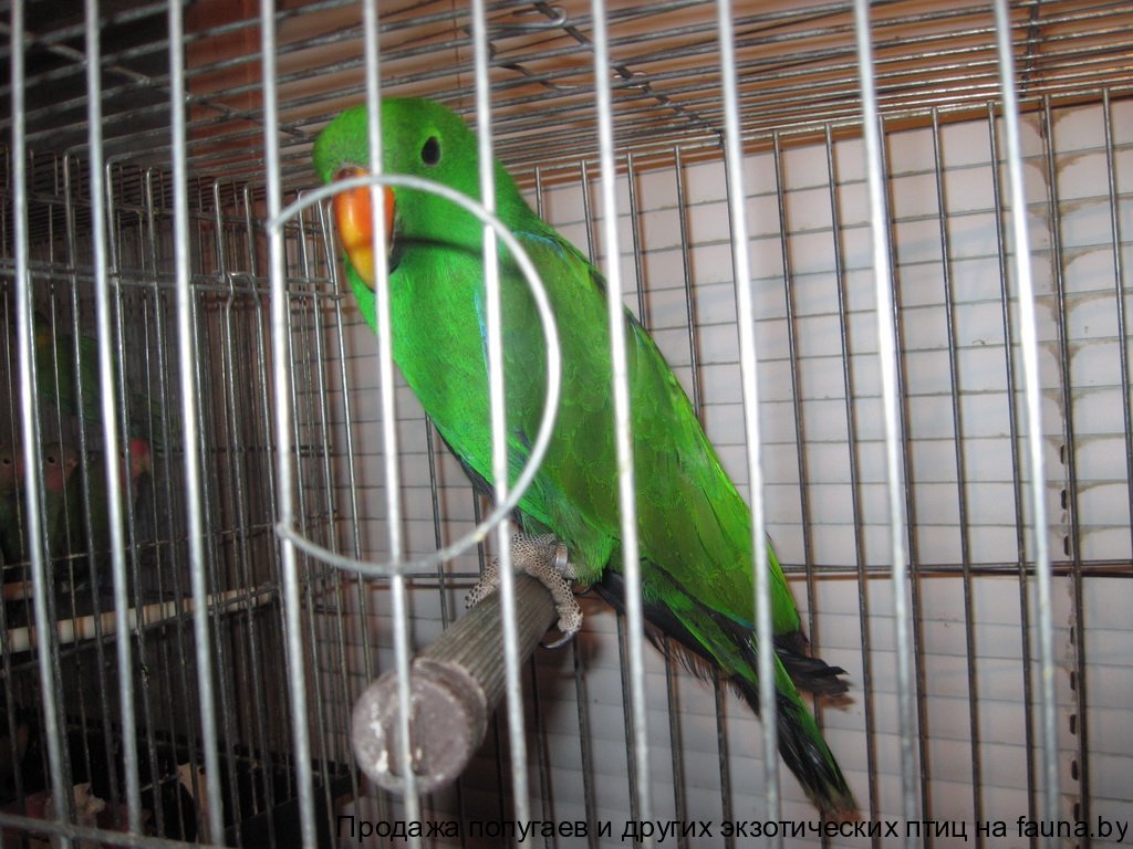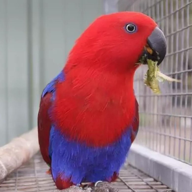 Эклектус – это спокойная и уравновешенная птица. Она долгое время и в полной тишине может сидеть на жёрдочке, теребя какую-нибудь игрушку.