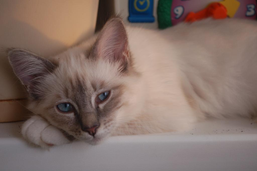 Если вы являетесь хозяином кошки именно такого окраса, можете считать себя счастливцем: это очень редкий цвет у невских маскарадных. Пойнты у них красного цвета, корпус почти всегда чисто-белый либо слегка золотистый. На фоне красной мордочки глаза кажутся ещё синее. Если котенку не исполнилось 2 месяцев, то легко спутать ред-пойнт и ред-табби-пойнт. Но даже когда повзрослев, окрас ред-пойнт в родословной может поменяться на ред-табби-пойнт. Определить точный окрас можно по потомству. Есть ещё одна разновидность этого окраса – крем-пойнт(SIB e 33) . Цвет шерсти сливочно-белый, а отметины пастельные кремовые.